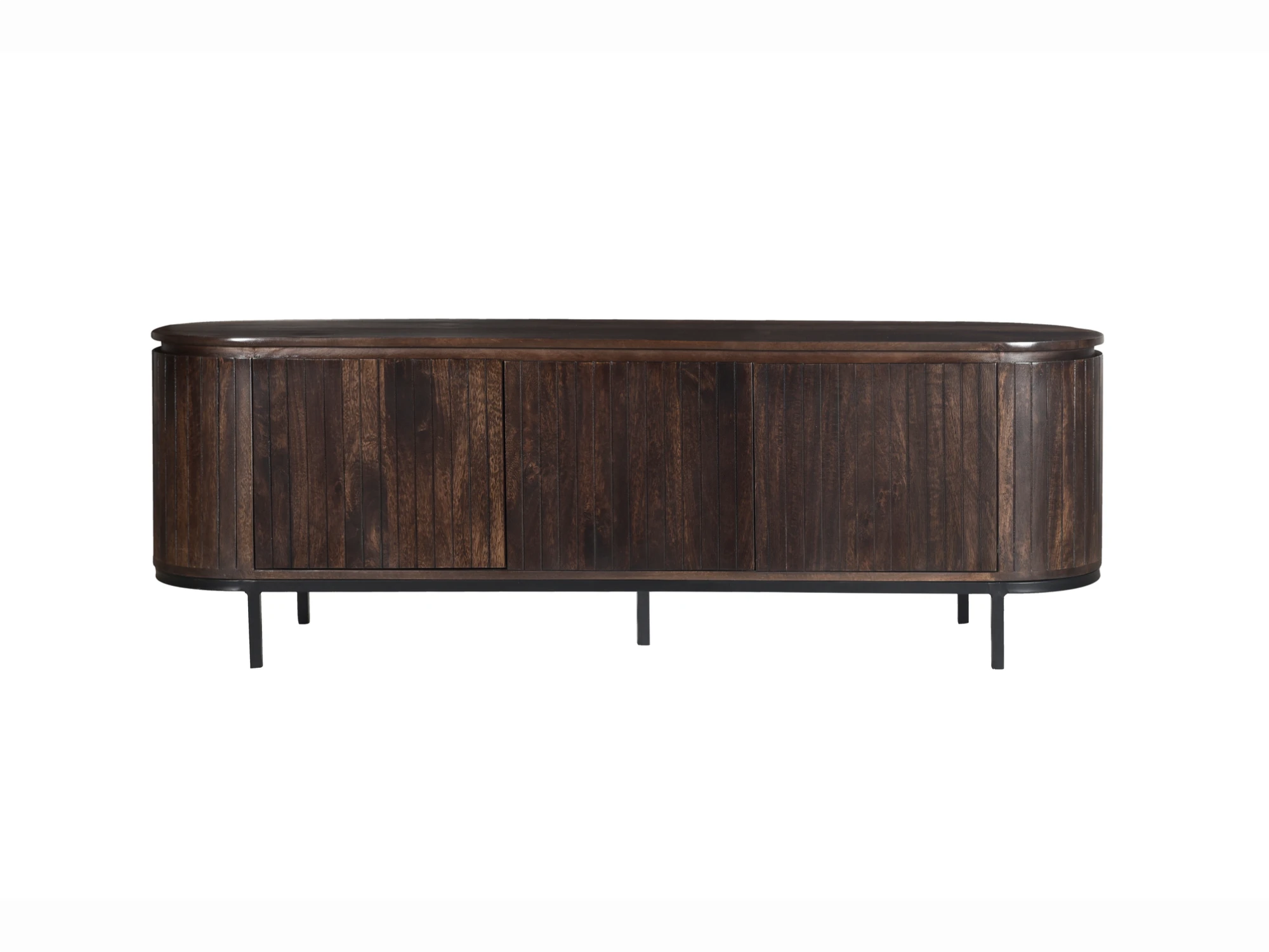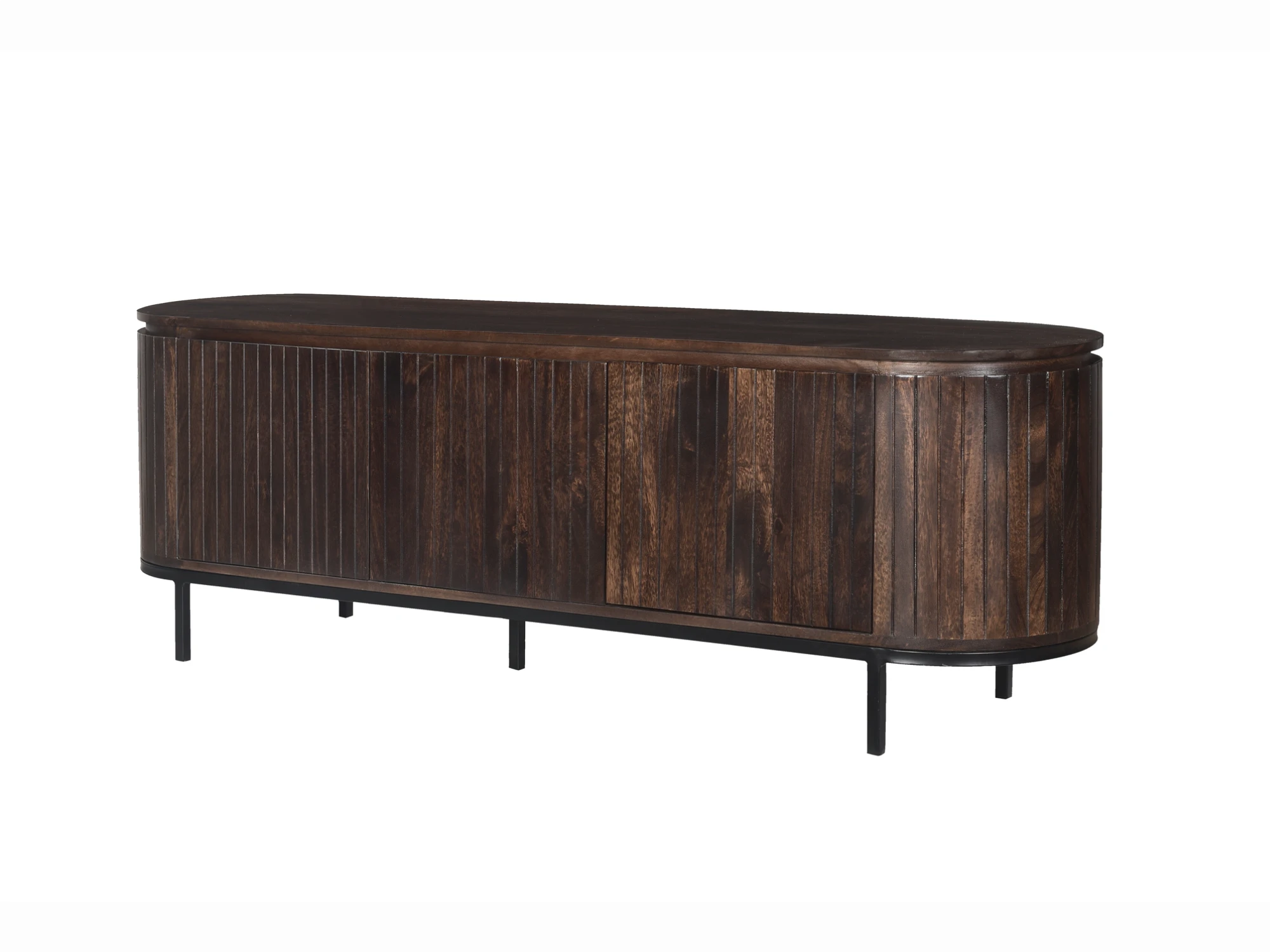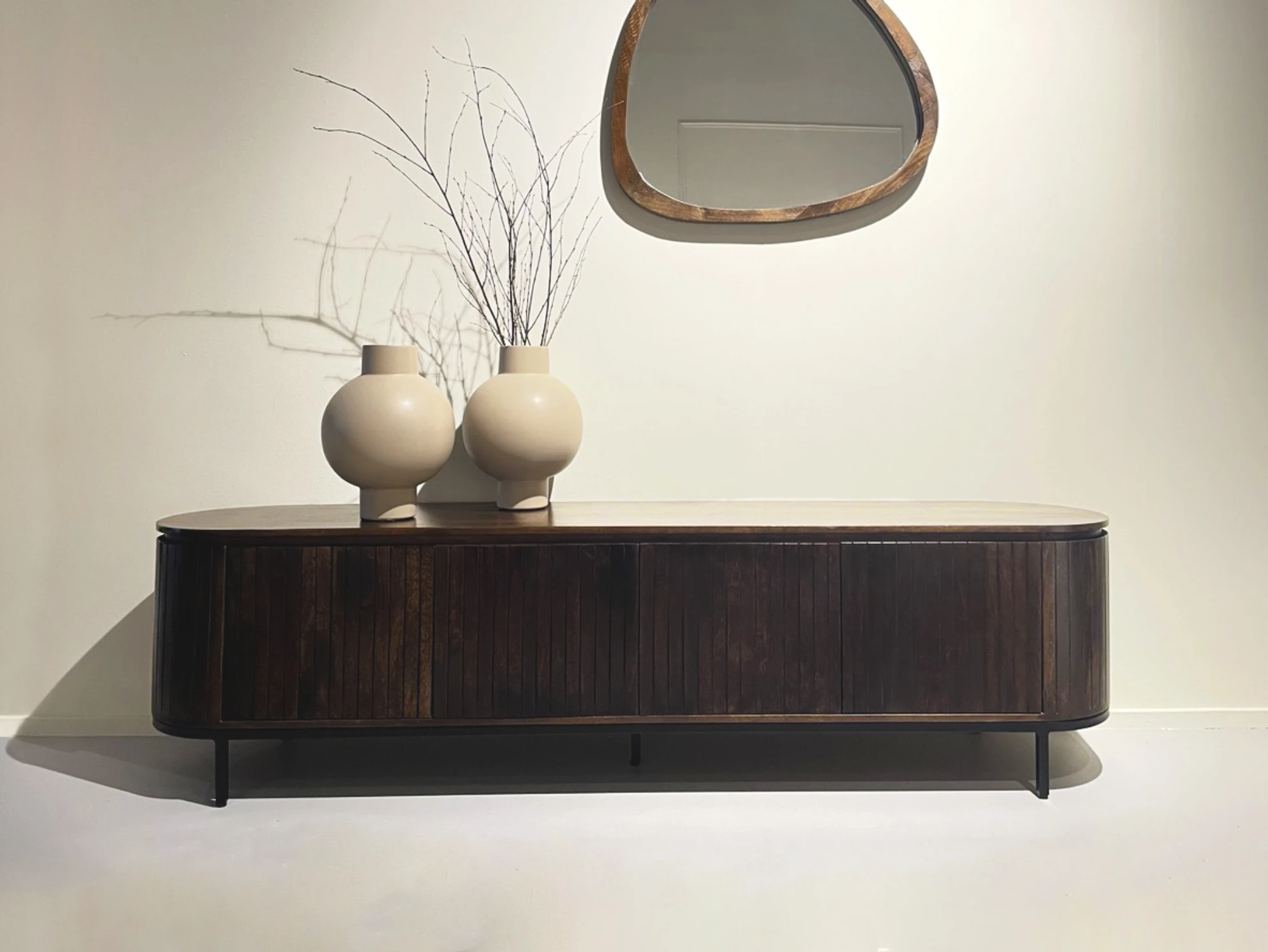 Der Noo 115W ist ein trendiger dunkelbrauner TV-Schrank mit schickem, stilvollem Aussehen. Dieser trendige TV-Schrank hat abgerundete Seiten, Flügeltüren und eine Walnussoberfläche. Dieser trendige TV-Schrank zeichnet sich durch seine eleganten, abgerundeten Linien und Holzlatten aus. Dieser Schrank besteht aus 1 Teil.