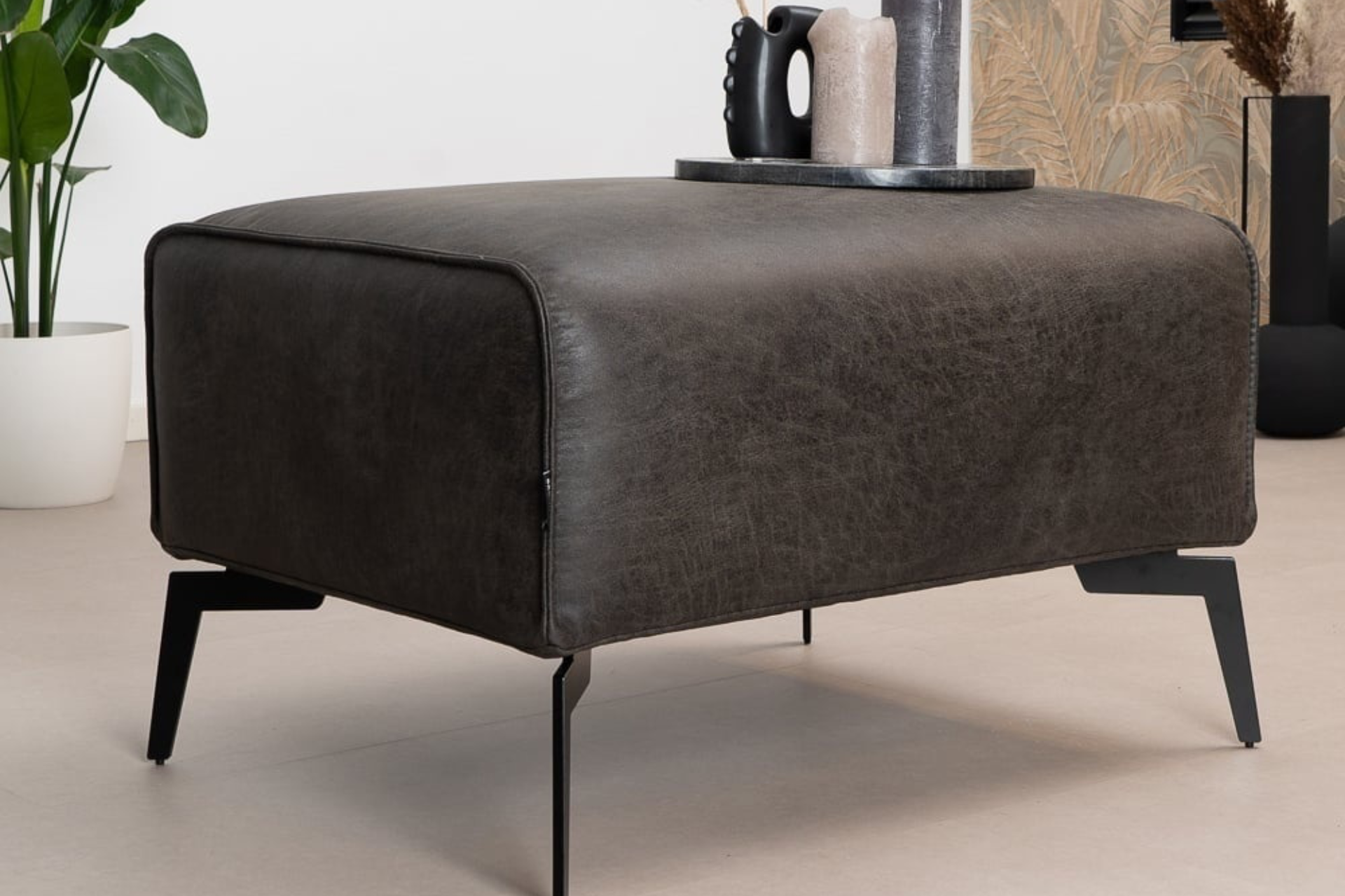 This durable, contemporary, and comfortable pouf in ECO leather has a modern look and therefore fits nicely in an industrial or contemporary interior. In addition to a modern interior, it also looks great with a classic or rustic style. The comfortable footstool can be used as a pouf to extend the Lentur sofas or as a luxurious side table or coffee table in the living room.