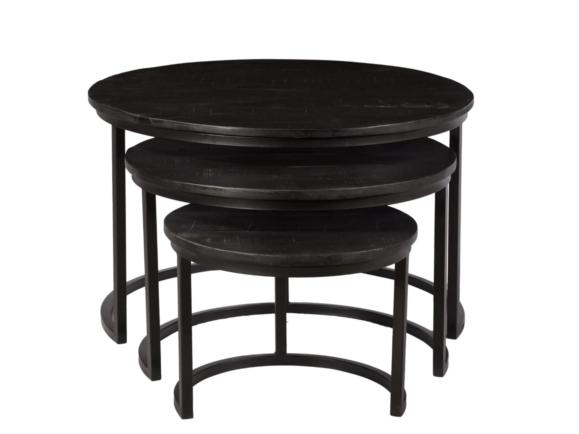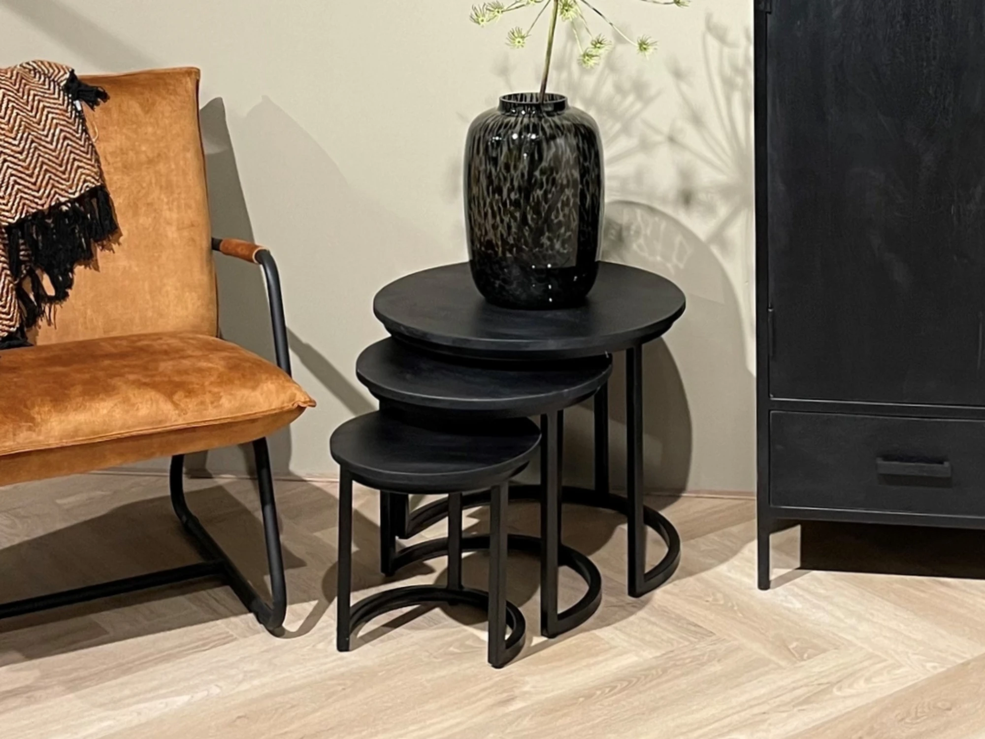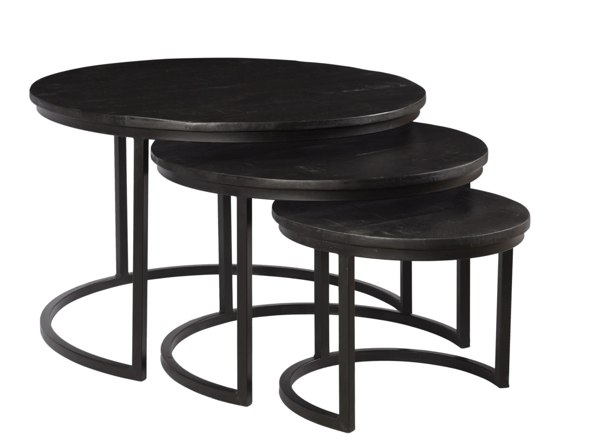 The Kal S3 is a set of 3 black round coffee tables or side tables. These tables come with a round top. The base of these black round coffee tables is a metal leg.