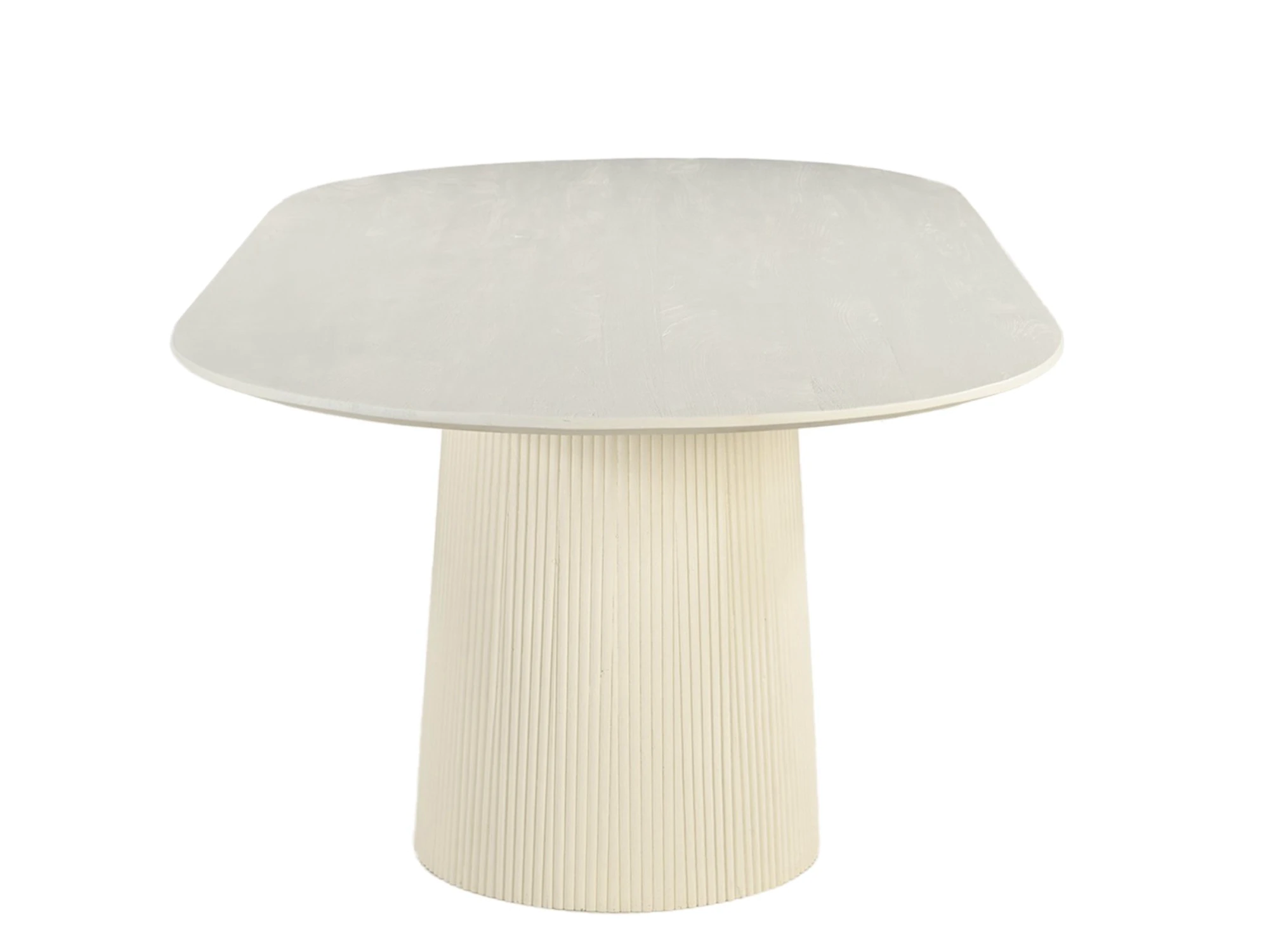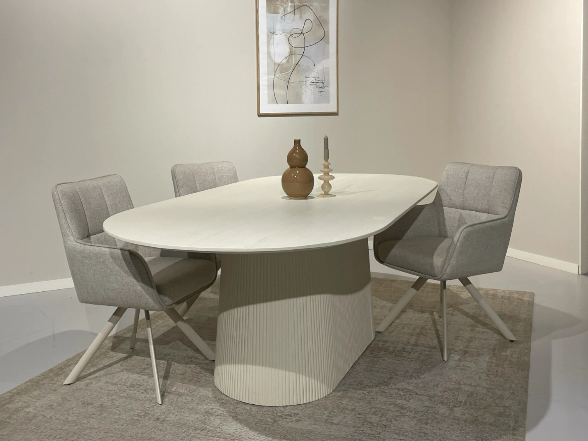 The Pat T230 is a beige dining table with a chic, stylish look. This trendy table features a rounded top, trendy design and is characterised by its stylish tapered leg. The base of this elegant dining table is a wooden leg.