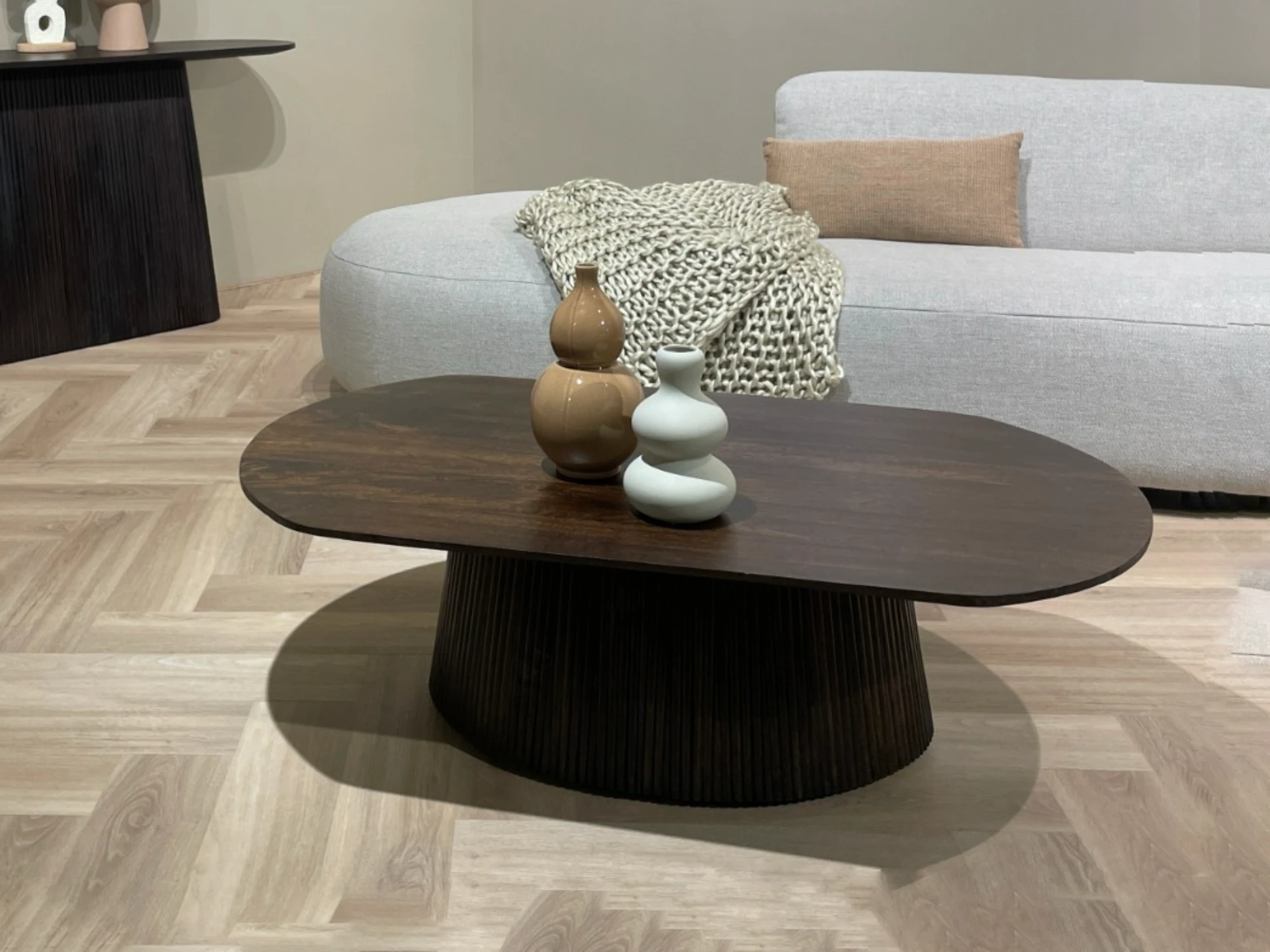 Unique oval dark brown coffee table with a chic slatted base. This table features an oval top, trendy design.
