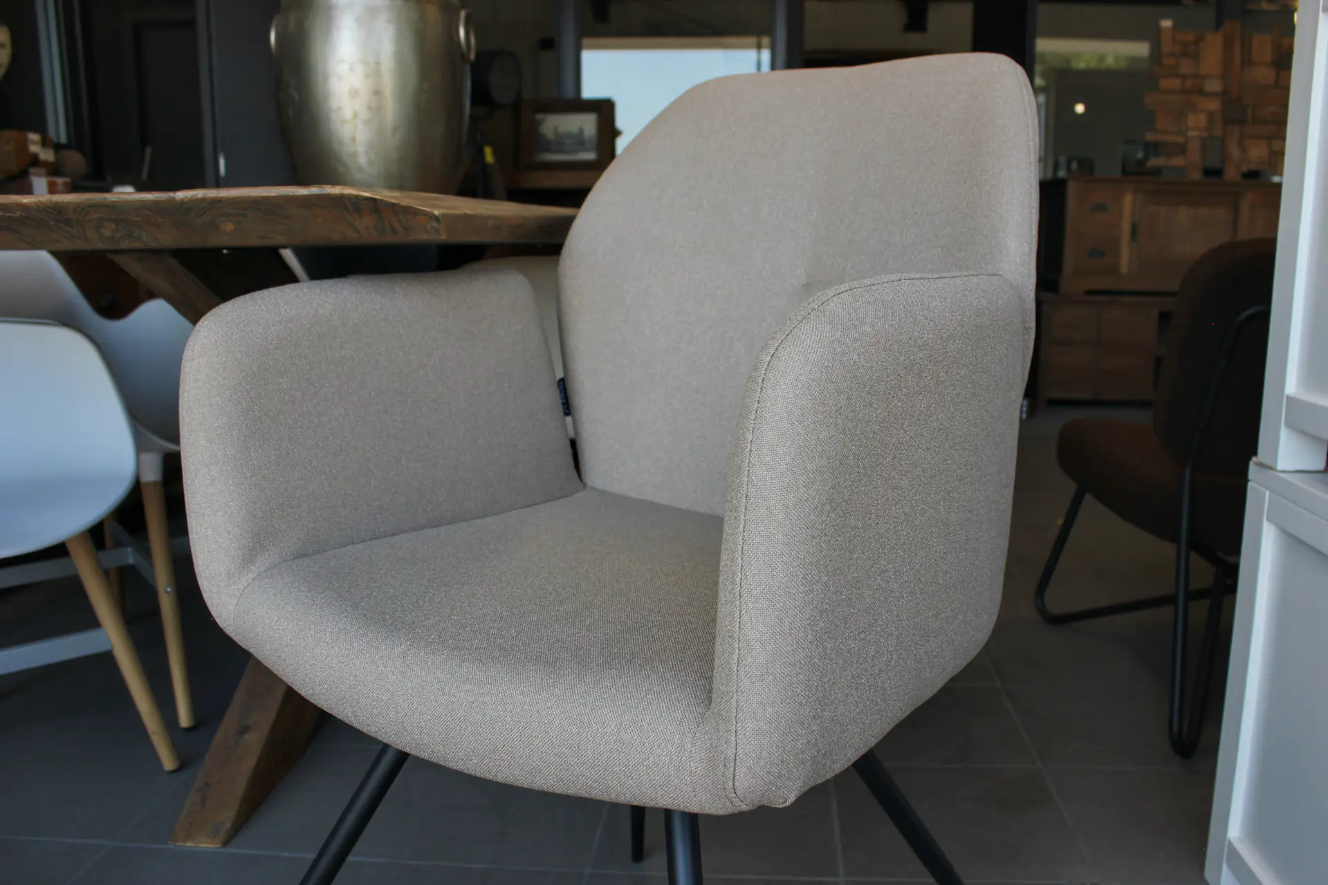Comfortable chair with Scandinavian look, sturdy dining chair in recycled polyester. The Scandic Arm is a luxurious dining chair with a contemporary look. This armchair is made of recycled polyester, a sustainable fabric made from 100% recycled plastic bottles. It is a very sturdy material with a Martindale score of 50,000, which ensures that the fabric remains beautiful for a long time. What's more, this material is water-repellent and the sturdy construction makes the chair ideal for use in the hospitality industry! This contemporary dining chair is available in multiple colors and finishes. The chair is characterized by its high backrest and separate armrests for an airy look. The base of this armchair is a metal spider leg. It can be beautifully combined with the wide range of teak tables at TEAK2.