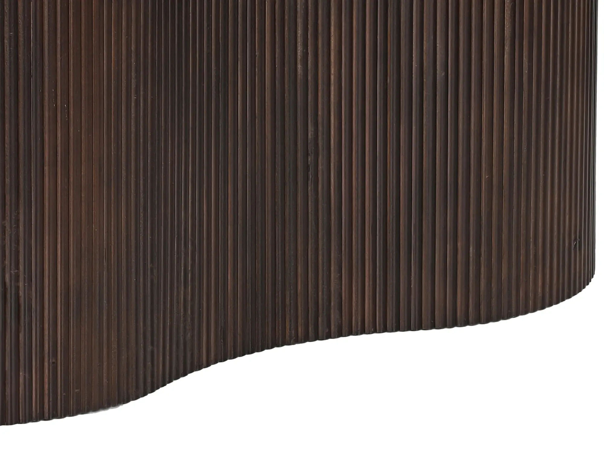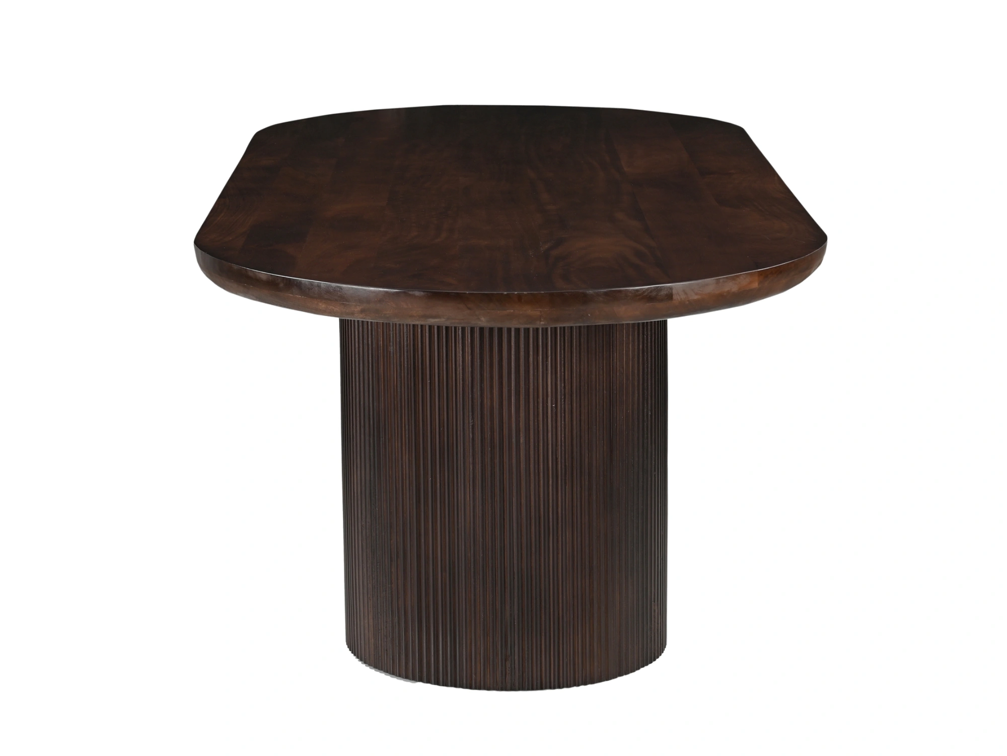 The Sev T220-300B is a dark brown dining table with a wavy slat base. This table has a rounded top, trendy design and is characterised by its distinctive wavy leg. The base of this trendy dining table is a wooden leg.