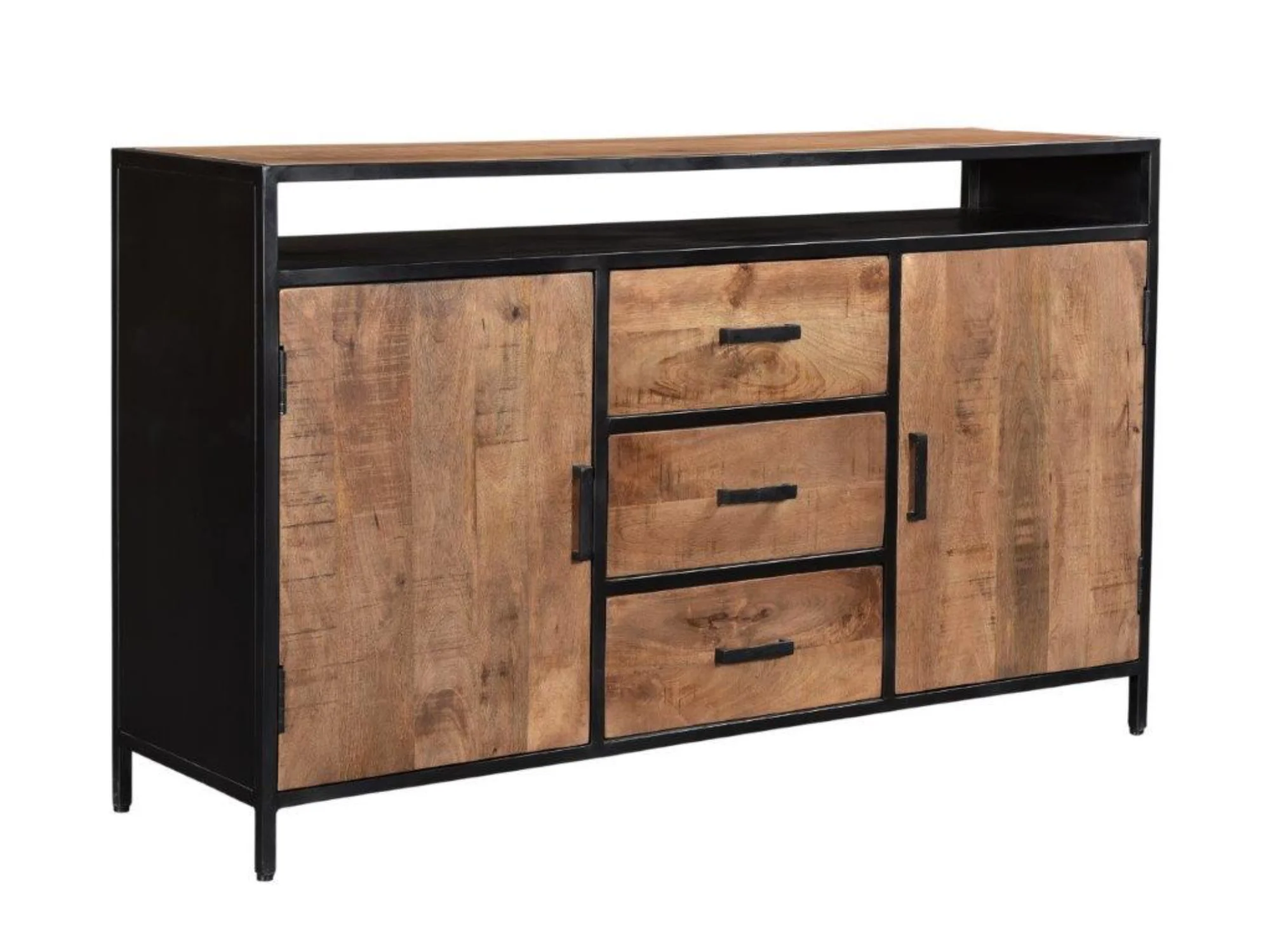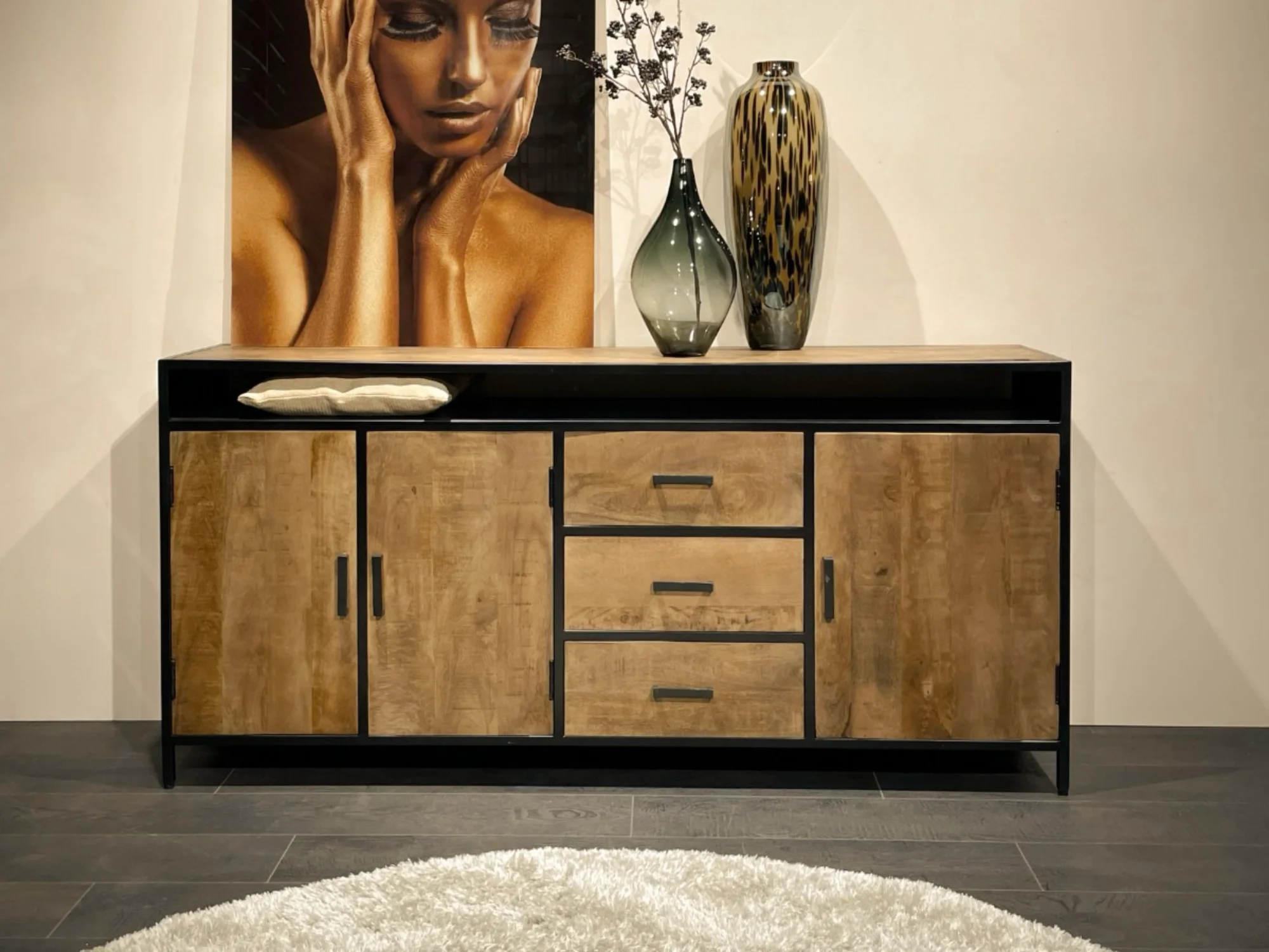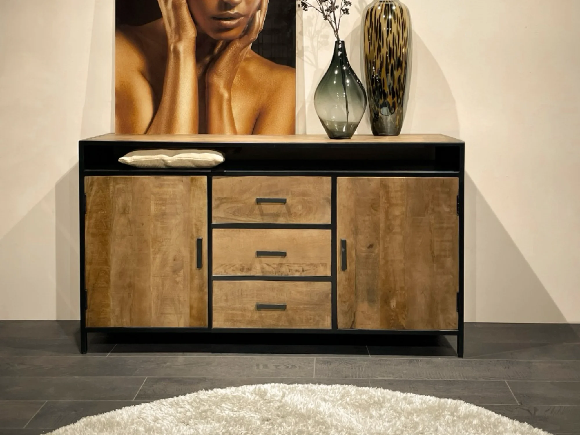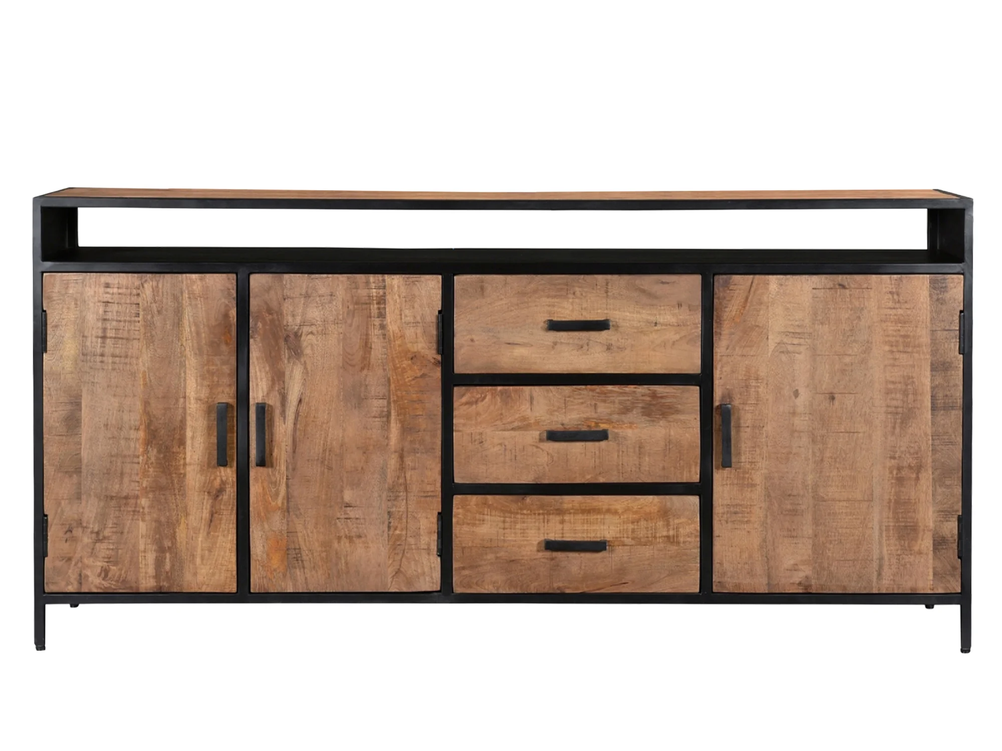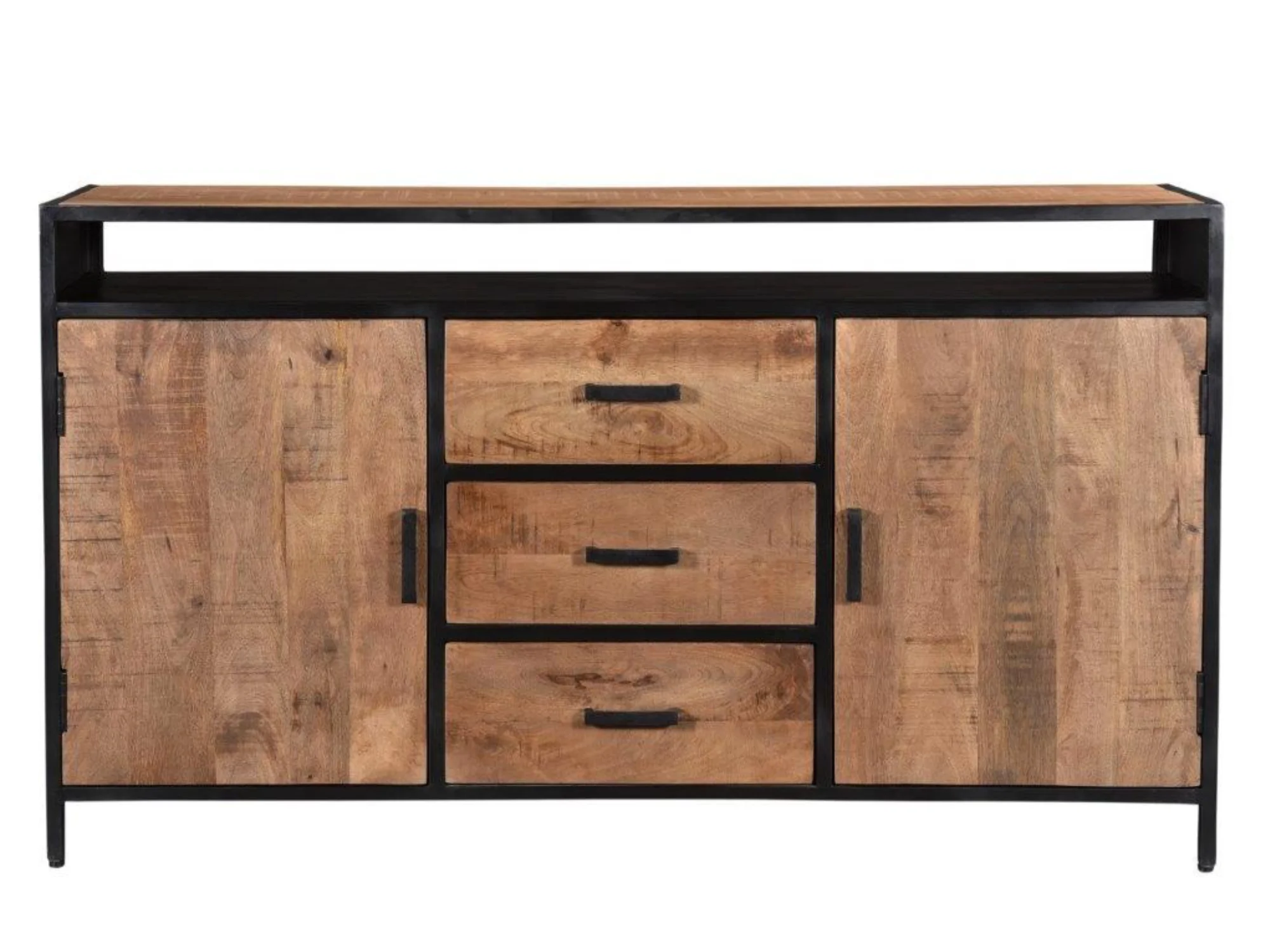 Le Kal D150-180 est un buffet industriel avec une base en métal. Ce buffet moderne est équipé de tiroirs et de portes à charnières. Ce buffet industriel se caractérise par un compartiment ouvert au-dessus des tiroirs et des portes. Le meuble repose sur une base métallique élégante. Ce meuble est composé de 1 pièce.
