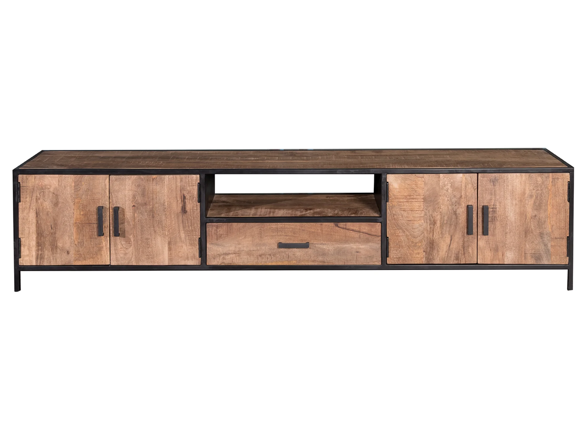 Le Kal TV160-220 est un meuble TV industriel avec un compartiment central ouvert. Ce meuble TV moderne est équipé de portes battantes et d'un tiroir. Ce meuble TV industriel se caractérise par son style minimaliste, sa structure métallique et son compartiment ouvert. Le meuble inférieur repose sur un élégant pied en métal. Ce meuble est composé de 1 partie.