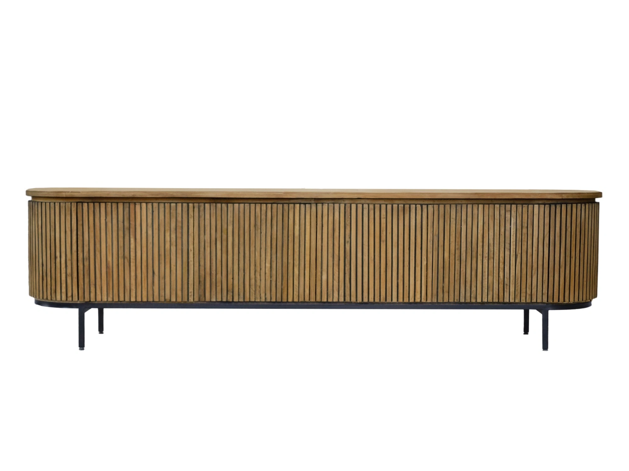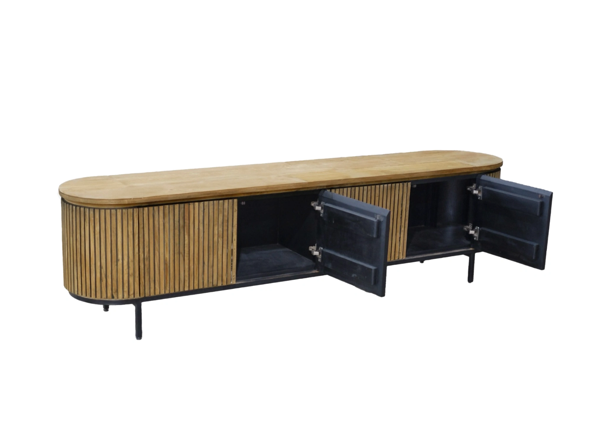 Le Lau TV170-210 est un meuble TV tendance en teck équipé de lattes. Ce meuble TV est équipé d'une base en métal et de côtés arrondis. La base de ce meuble TV en teck est un pied en métal.