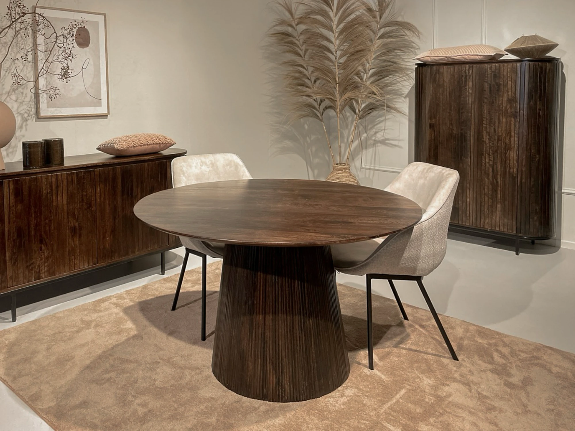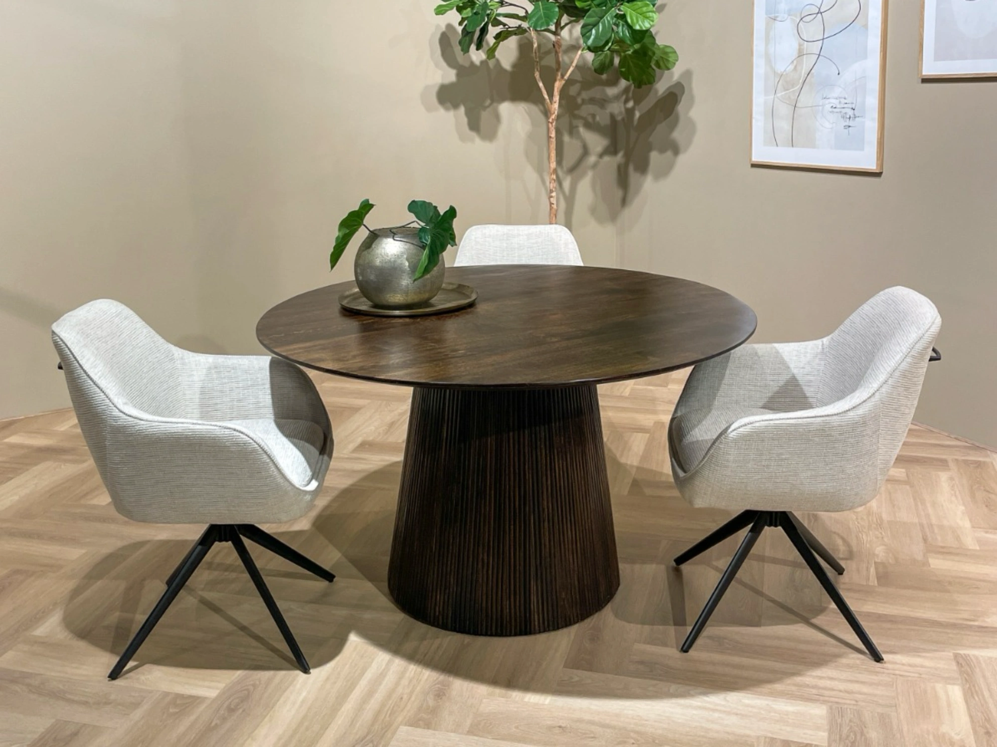 La Sal TR130 est une table de salle à manger ronde de couleur marron foncé avec un piètement à lattes chic. Cette table est dotée d'un plateau rond, d'un design tendance et se caractérise par un élégant pied fuselé. La base de cette élégante table de salle à manger est un pied en bois.