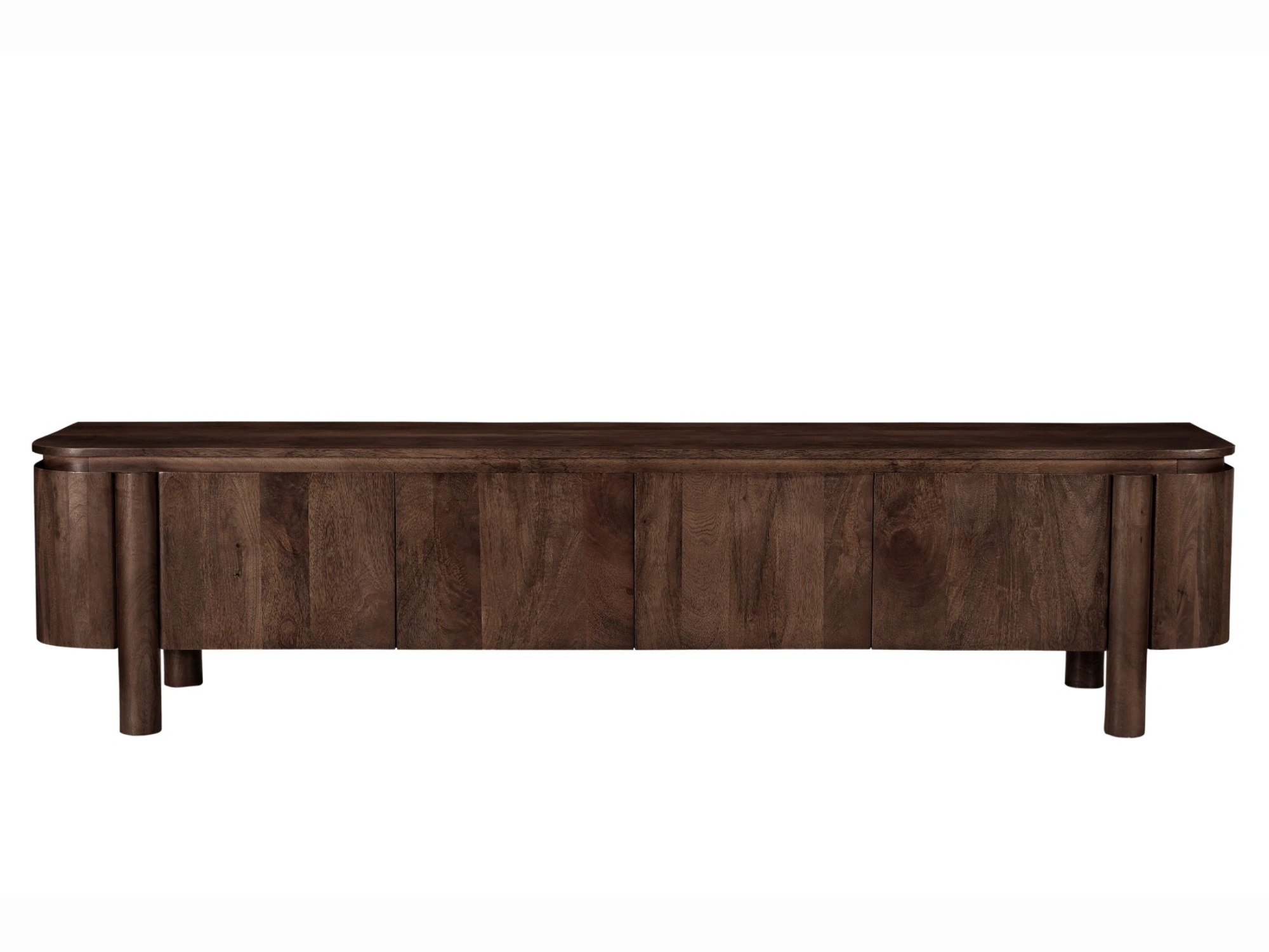 Le Sal TV170-210B est un meuble TV moderne de couleur marron foncé avec un design rond et des pieds remarquables. Ce meuble TV en bois présente des côtés arrondis et des portes à charnières. Ce meuble TV moderne de couleur marron foncé se caractérise par un design rond et des pieds ronds typiques. Ce meuble est composé de 1 partie.