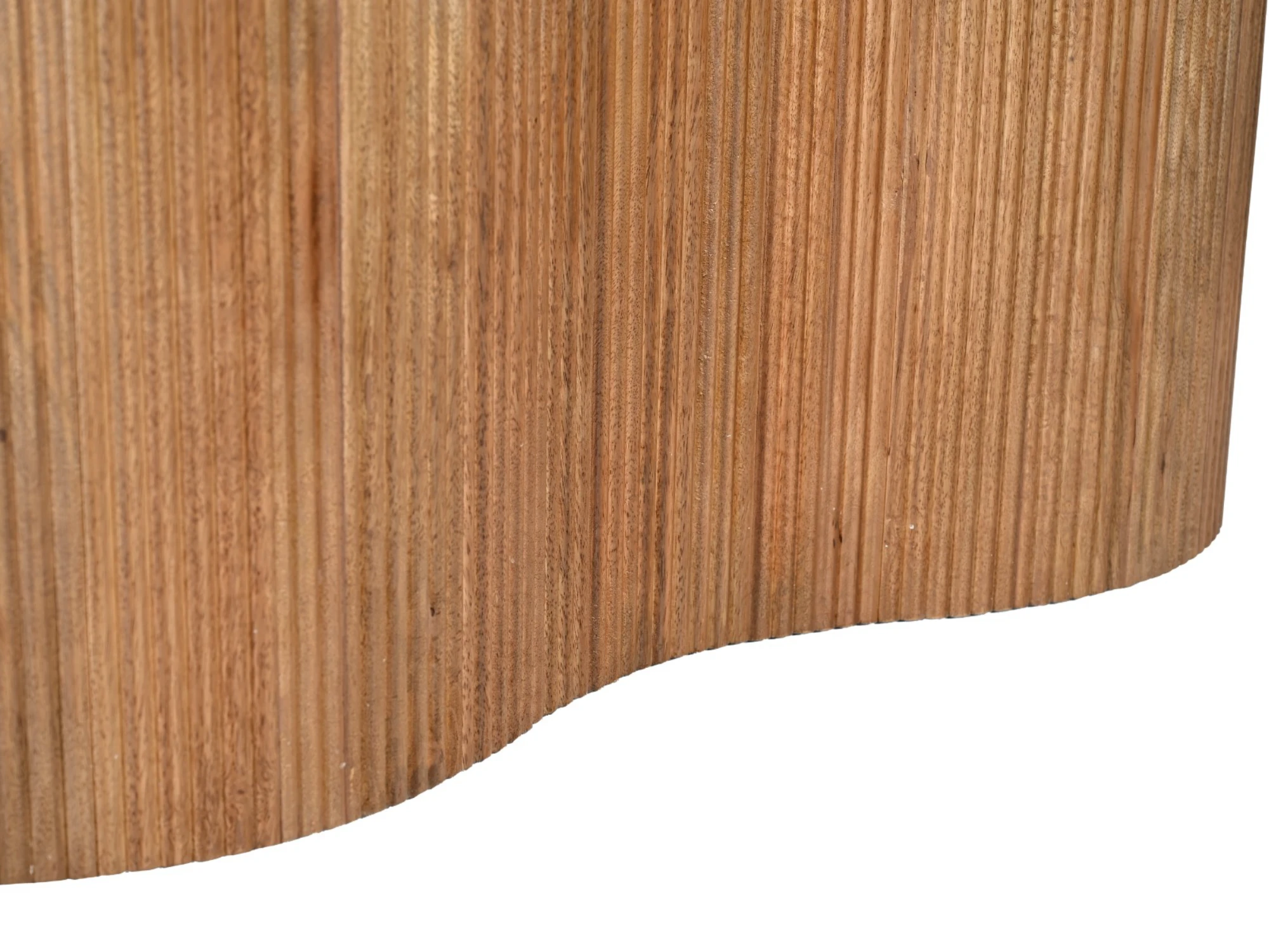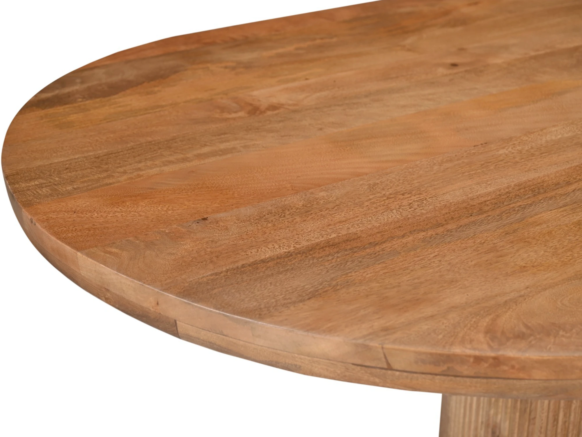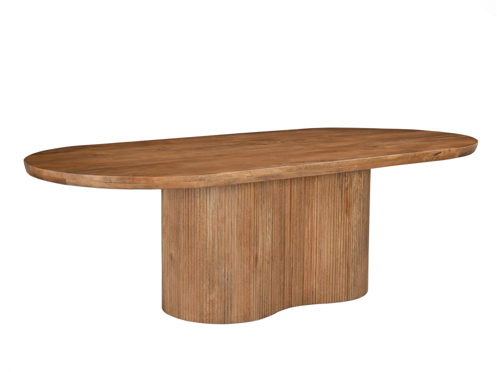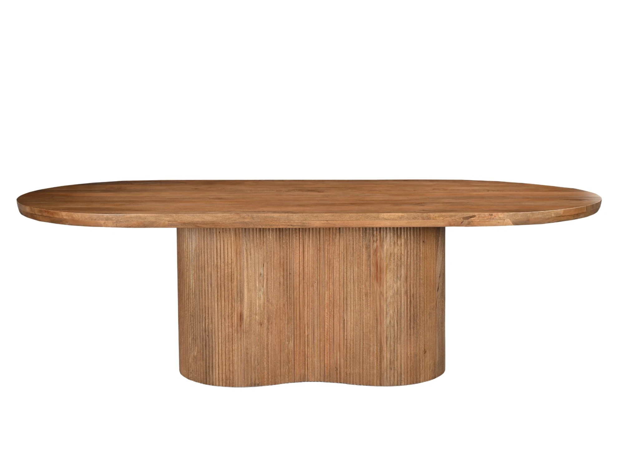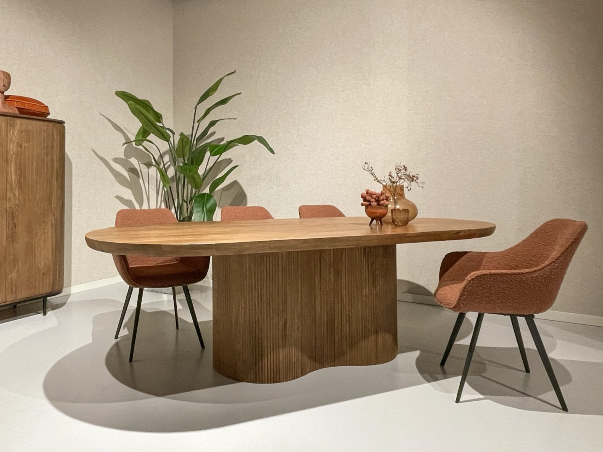 La Sev T220-300 est une table de salle à manger avec un piètement à lattes ondulées. Cette table a un plateau arrondi, un design tendance et se caractérise par son pied ondulé caractéristique. Le piètement de cette table de salle à manger tendance est un piètement en bois.