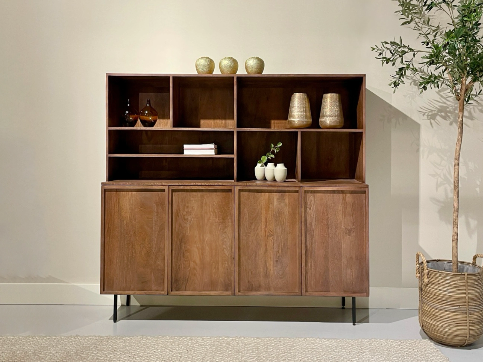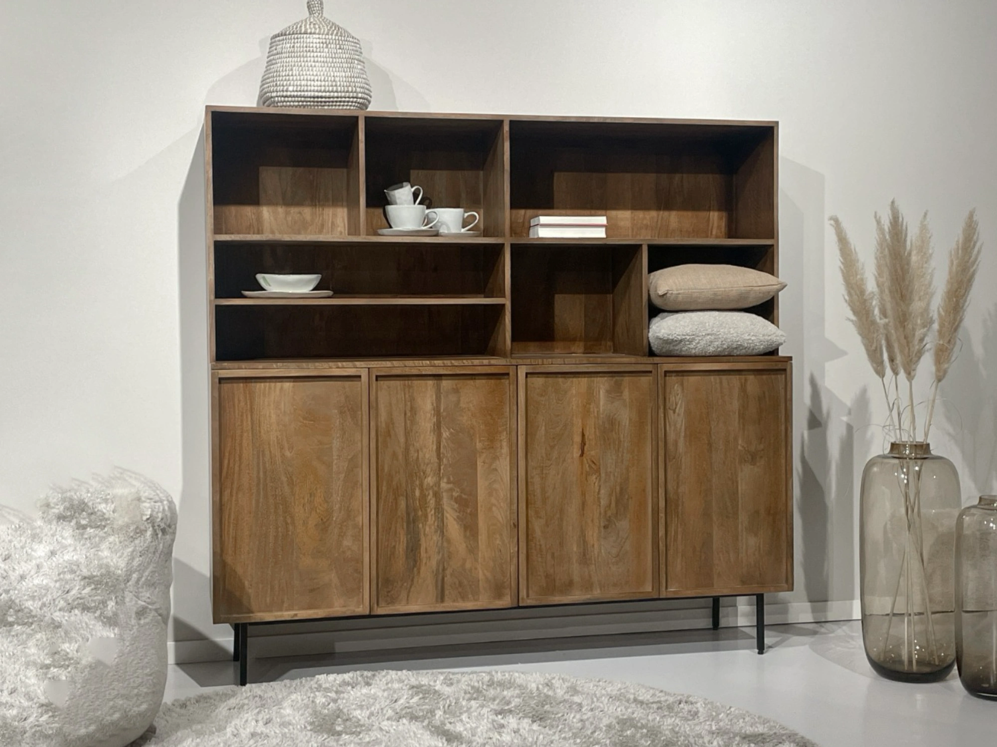 Buffetkast met open vakken. Deze strakke kast is uitgevoerd met draaideuren en typeert zich door de minimalistische stijl en open vakken.