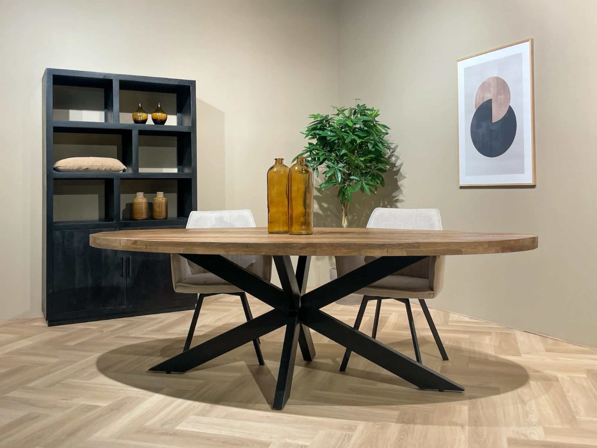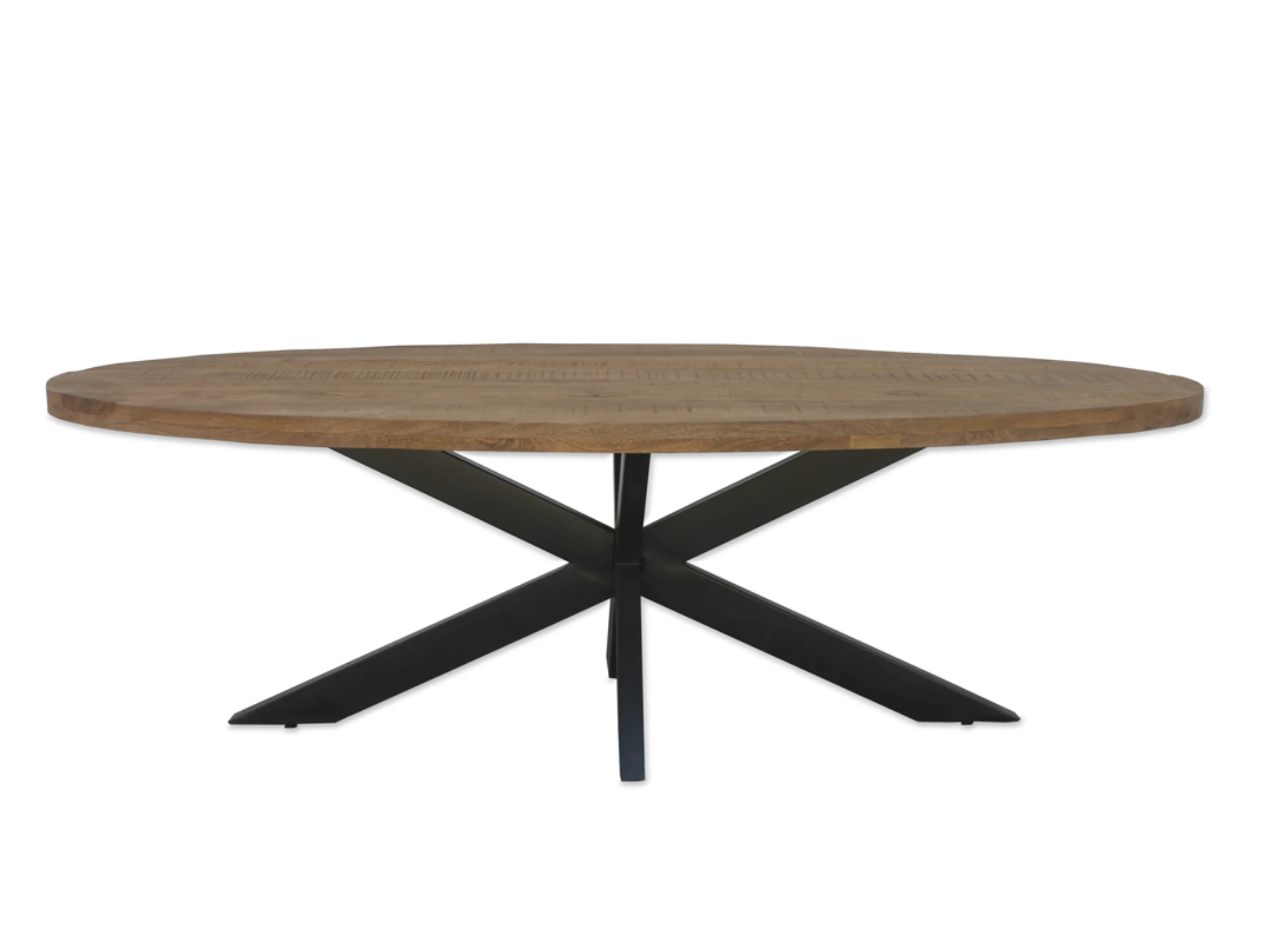 De Kal TO160-240X is een industriële ovale eettafel hout met metalen spinpoot. Deze ovale tafel is uitgevoerd met een duurzaam hardhouten blad. Het onderstel van deze industriële ovale eettafel is een metalen spinpoot.