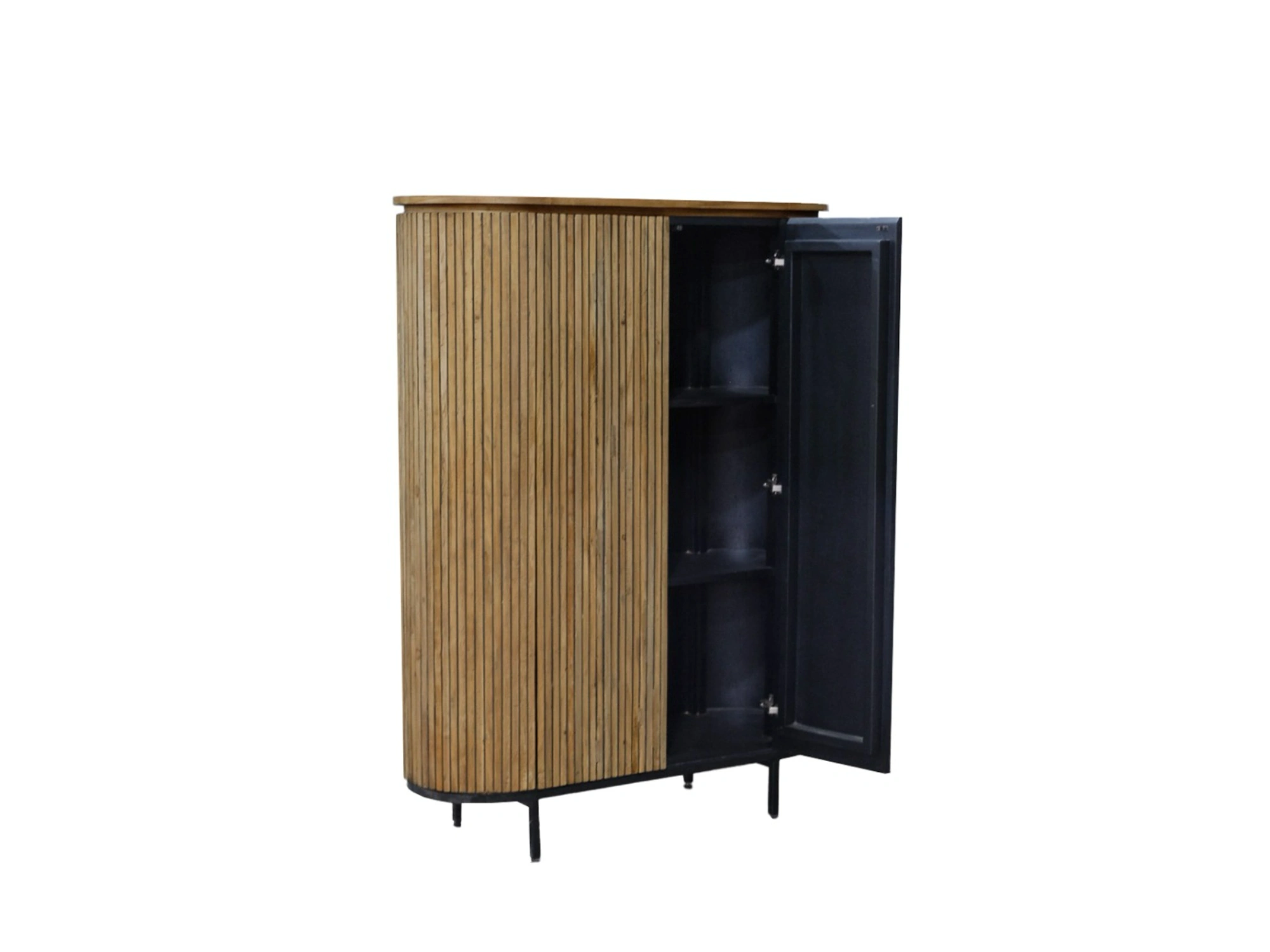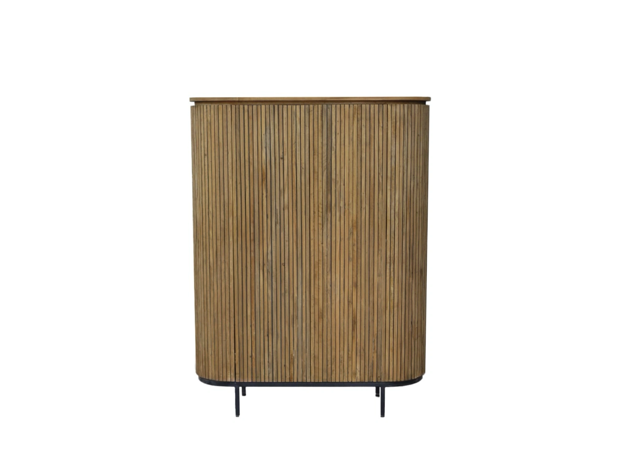 De Lau 115 is een trendy teak wandkast, uitgerust met latjes. Deze kast is uitgevoerd met een metalen onderstel en afgeronde zijkanten. De bovenkant is uitgevoerd met een moderne koof en de onderkast staat op een strakke metalen poot. Dit meubel bestaat uit 1 deel.